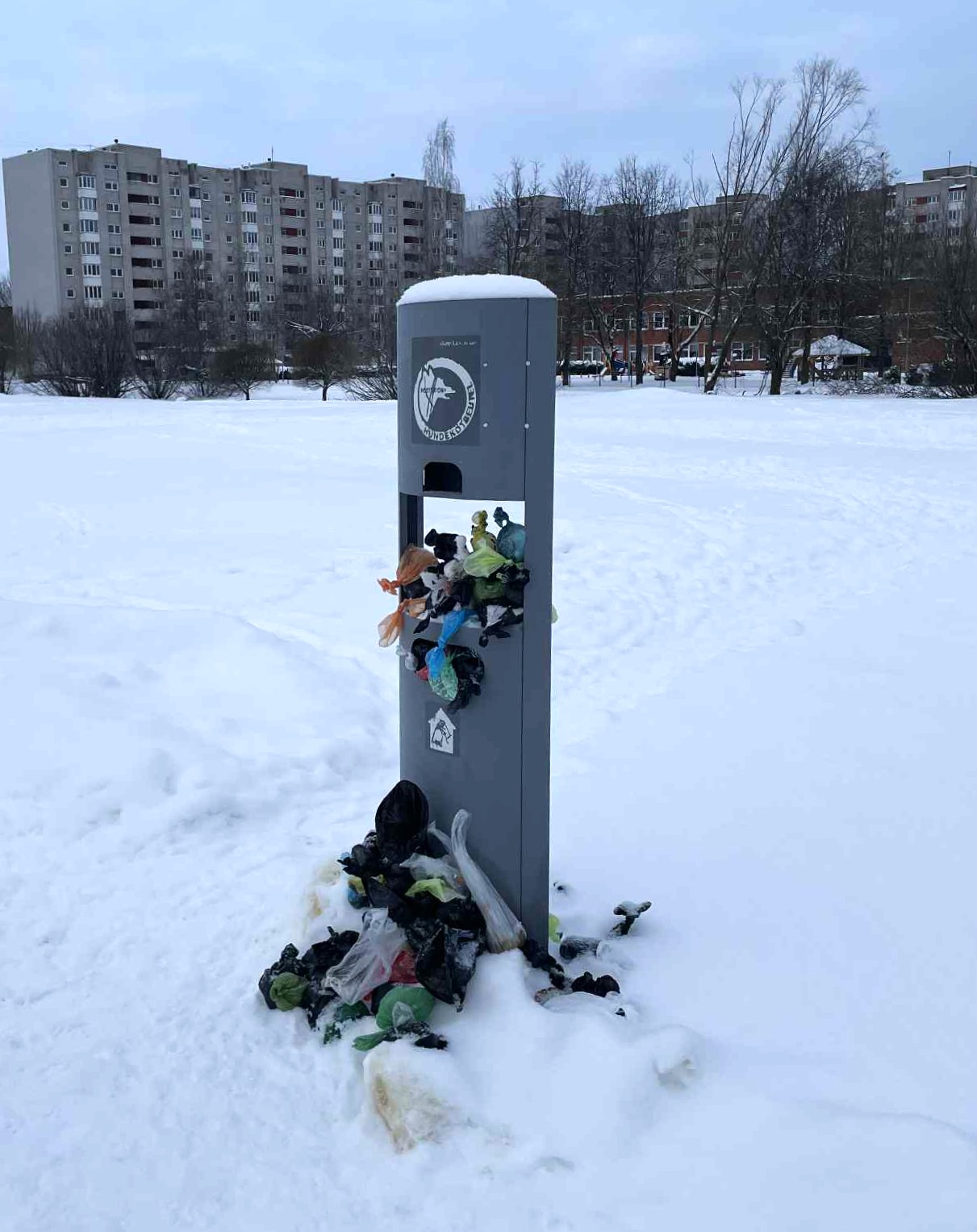 Вот так выглядела утром 13 января дог-станция у торгового центра Megamarket, напротив входа в клуб AveNue. Судя по всему, урну в ней не опустошали с начала года, также ни разу с начала года в отсеке для пакетов эти самые пакеты для собачьих отходов не появлялись. Как, впрочем, и в ближайшей к ней дог-станции, что в парке Паю.
